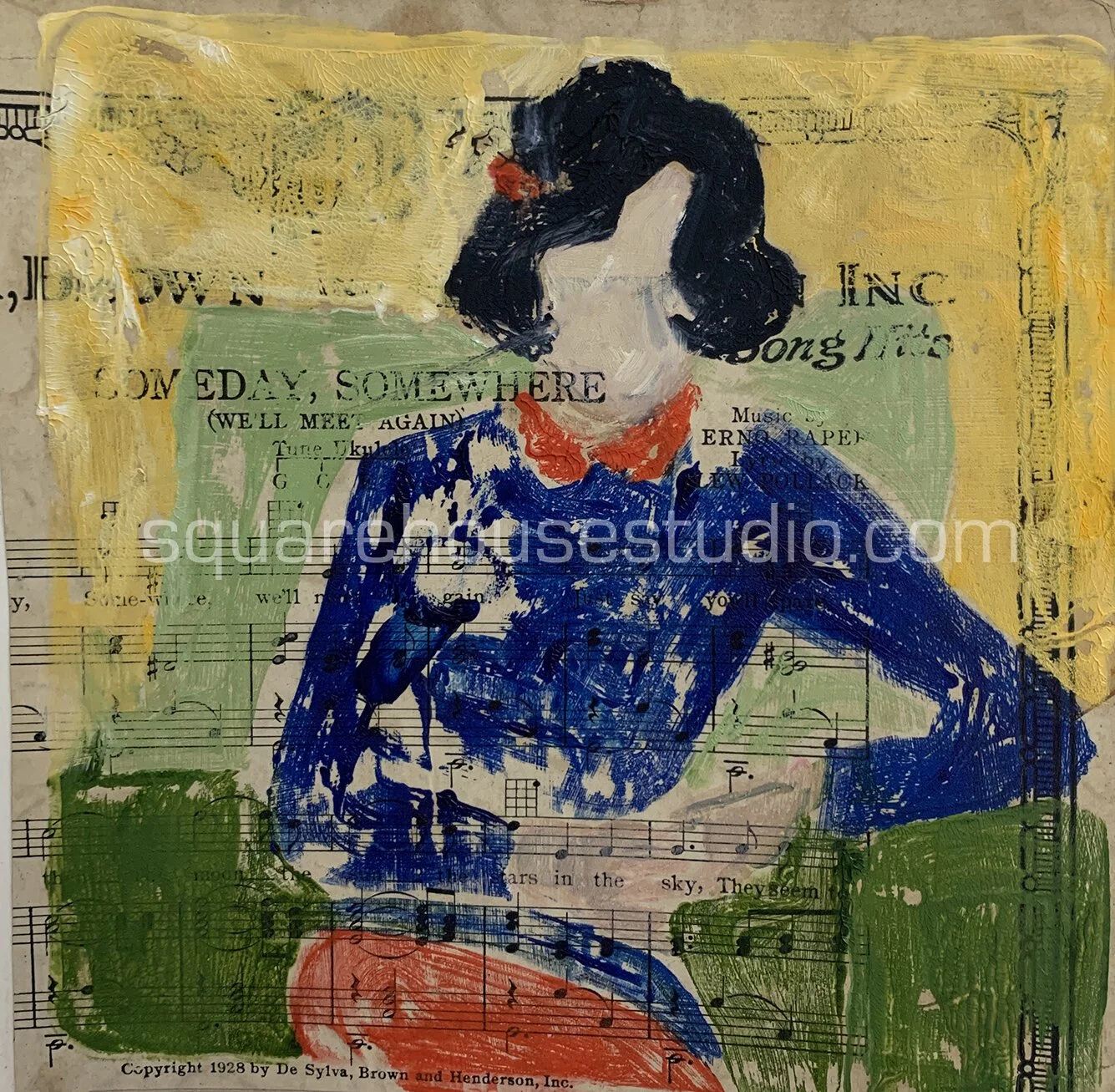 SWEET LADY, 6x6 inches, gelli monotype in oil with collage, NFS